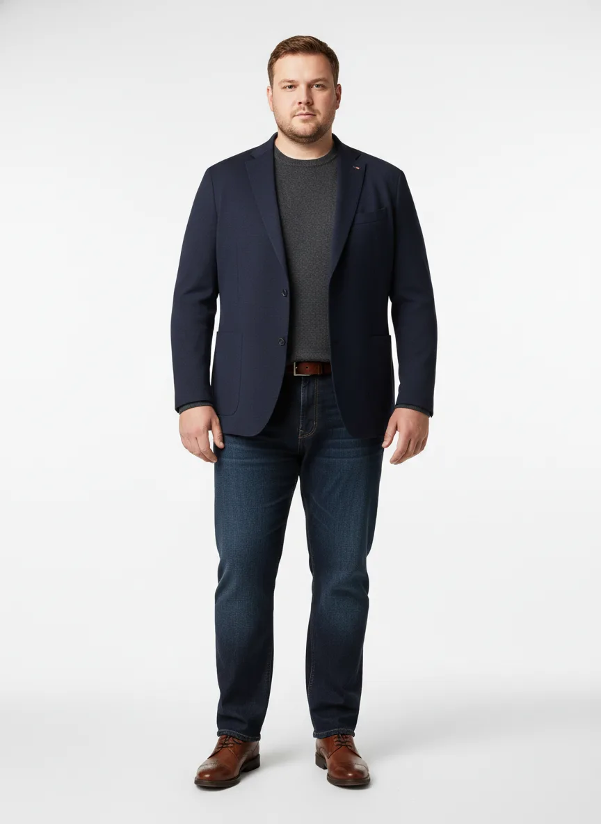 Man's navy blue blazer: Navy Blue flatters fair skin, adds structure to balance a few extra pounds, and smartens a casual look without feeling overdressed.