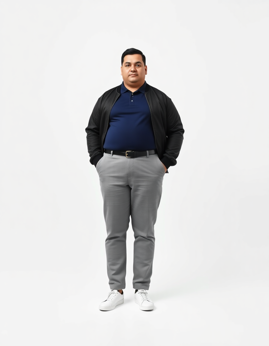 Mans grey chinos: Grey chinos are versatile and comfortable, providing a good fit for a few extra pounds while giving a relaxed vibe suitable for casual outings.