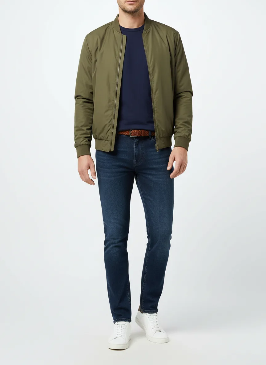 Man's olive lightweight bomber jacket: Adds structure and warmth while keeping the look relaxed and age-appropriate.