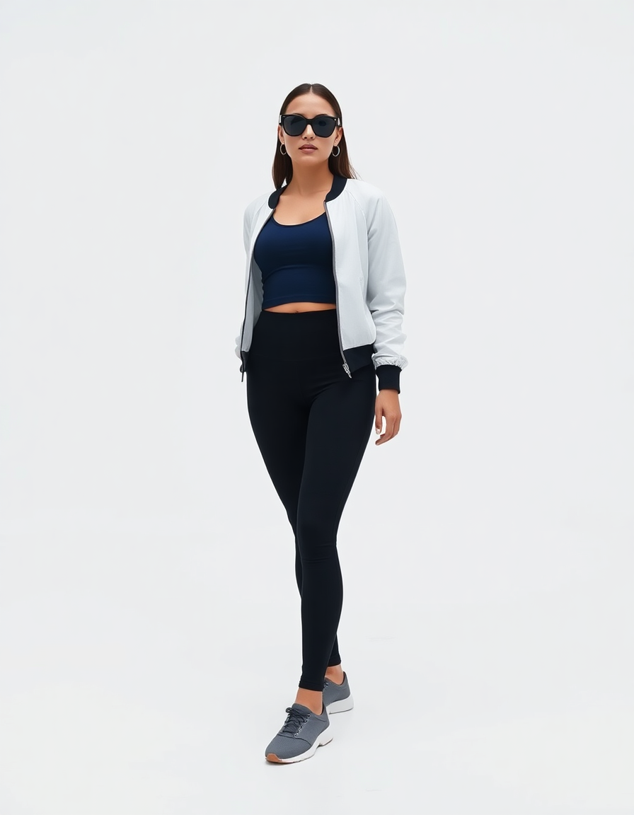 Womans black high-waisted leggings: womans white lightweight bomber jacket