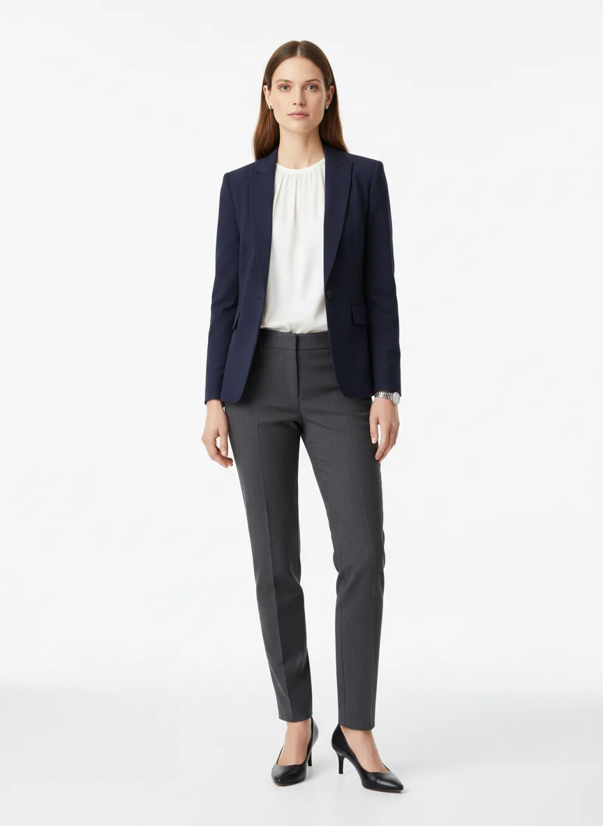 Woman's tailored navy blue blazer: Classic, professional layer that suits Swedish minimal style and creates a polished silhouette for interviews