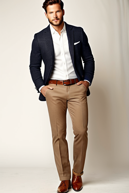 Man’s navy blue blue wool trousers: man’s vintage leather belt in tan