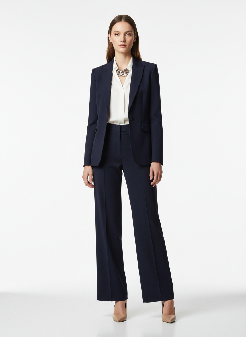 Womans tailored navy blue blazer: A structured blazer adds professionalism and is flattering for a tall body type.