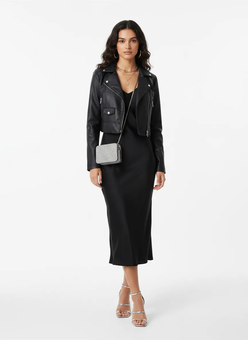 Woman cropped faux leather moto jacket: Adds edge and warm coverage for cooler entrances without hiding the dress.